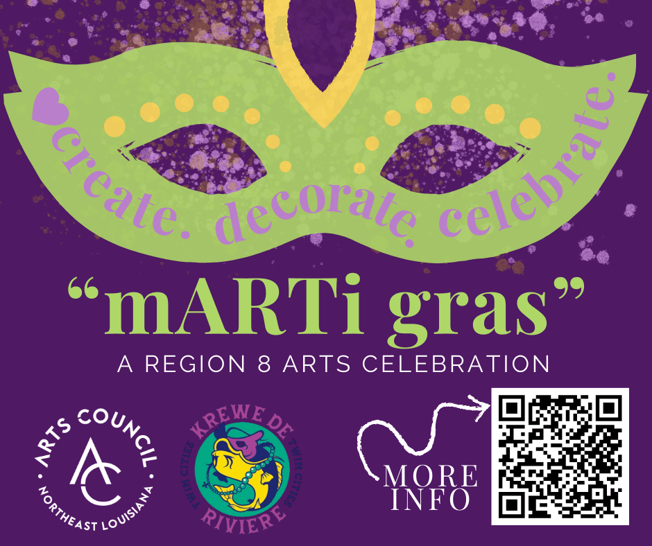 Celebrate Mardi Gras with a burst of creativity! The Northeast Louisiana Arts Council invites students, families, and classrooms across Region 8 to take part in our mARTi Gras Mask Project - a fun, free, no-pressure art activity for kids of all ages.