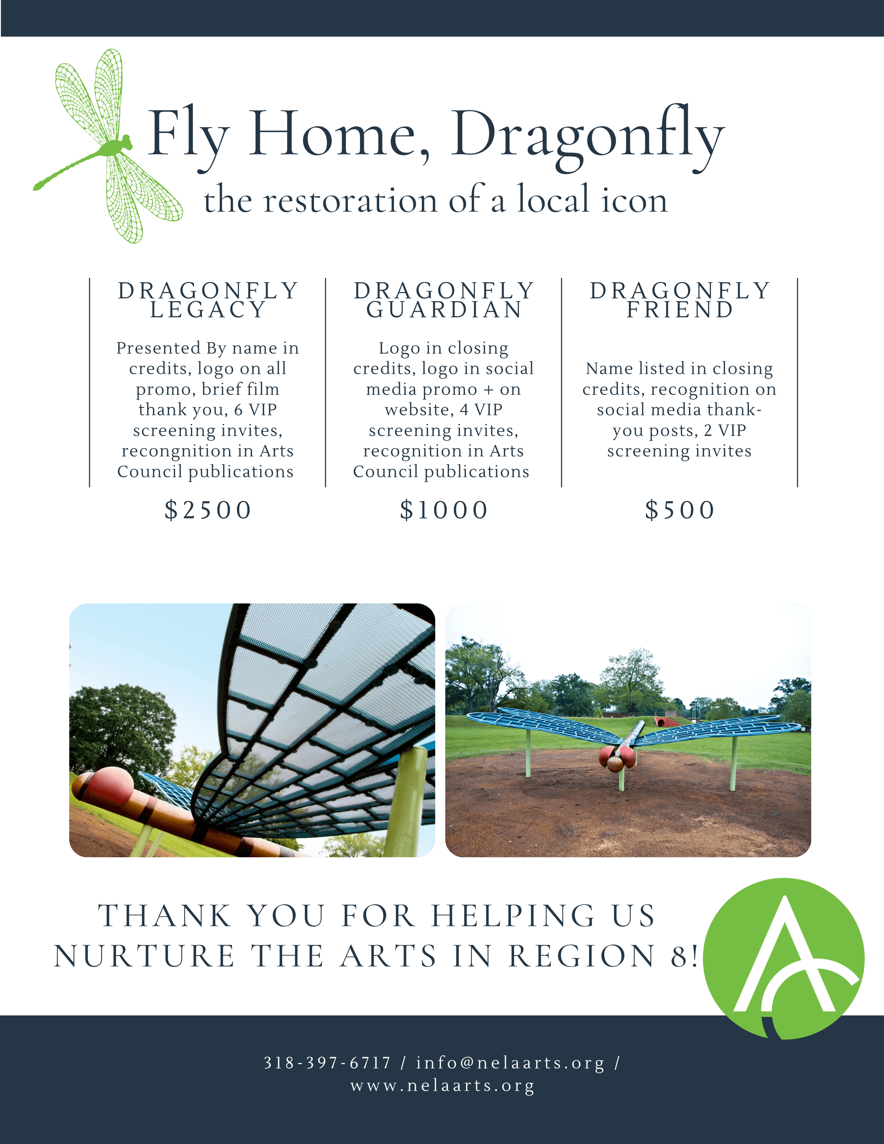 We are still actively taking donations to cover the restoration and ongoing care for the Dragonfly, as well as Edmund's other public art works in the Ouachita Parish area. Consider joining us in these efforts by making a donation below.