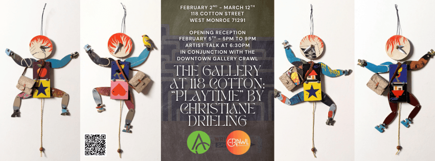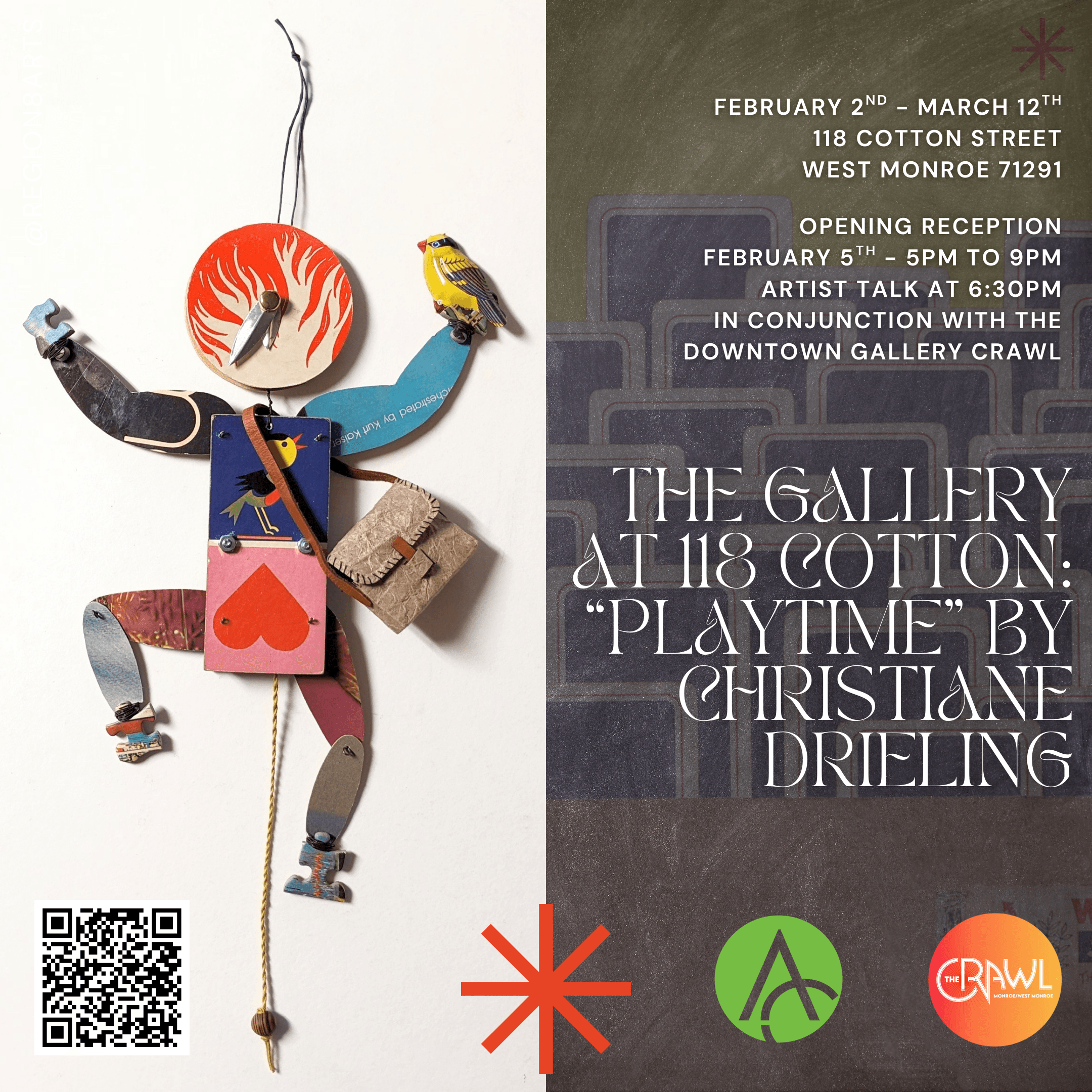 The Northeast Louisiana Arts Council is pleased to present Playtime, a solo exhibition by collage and assemblage artist Christiane Drieling, on view at The Gallery at 118 Cotton from February 2 through March 12.