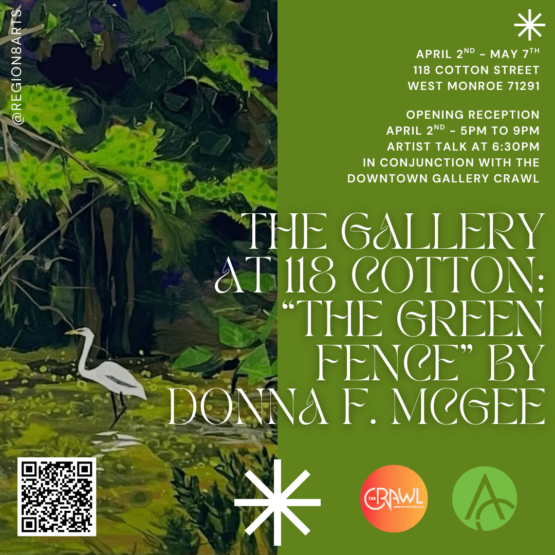 The Northeast Louisiana Arts Council is proud to present “The Green Fence,” a solo exhibition by West Monroe artist Donna F. McGee at The Gallery at 118 Cotton.