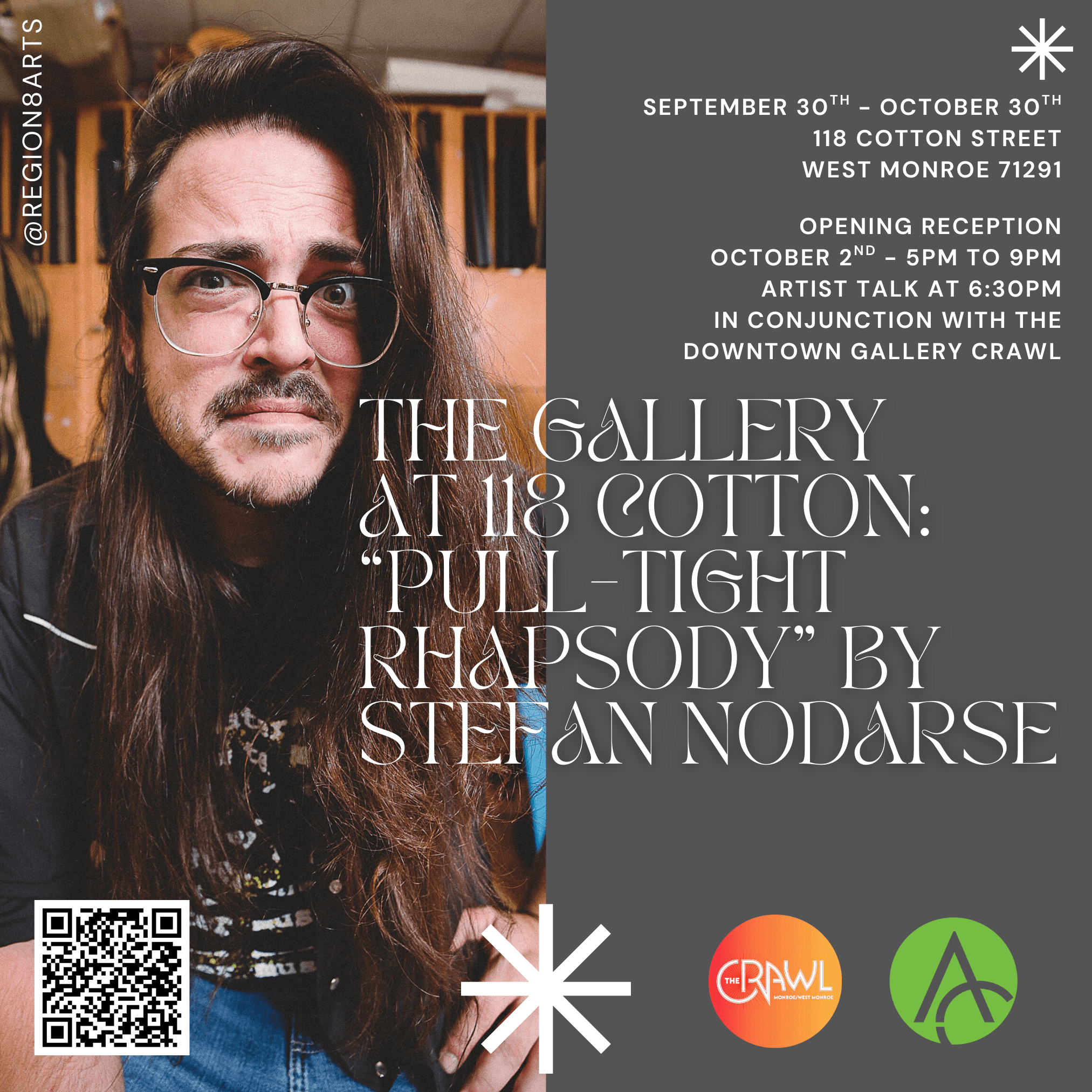 The Arts Council is honored to showcase the work of Region 8 artist Stefan Nodarse in a solo exhibition here at The Gallery at 118 Cotton Street in Downtown West Monroe from September 30th - October 30th. The opening reception will be held October 2nd from 5pm to 9pm with an artist talk at 6:30pm in conjunction with the Downtown Gallery Crawl!