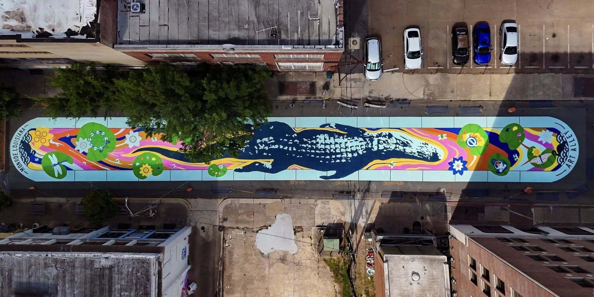 Art Alley-Gator — the largest street mural in Louisiana, by Region 8 artists Ashley Greer & Daniel Myers, located in Downtown Monroe on Art Alley.
