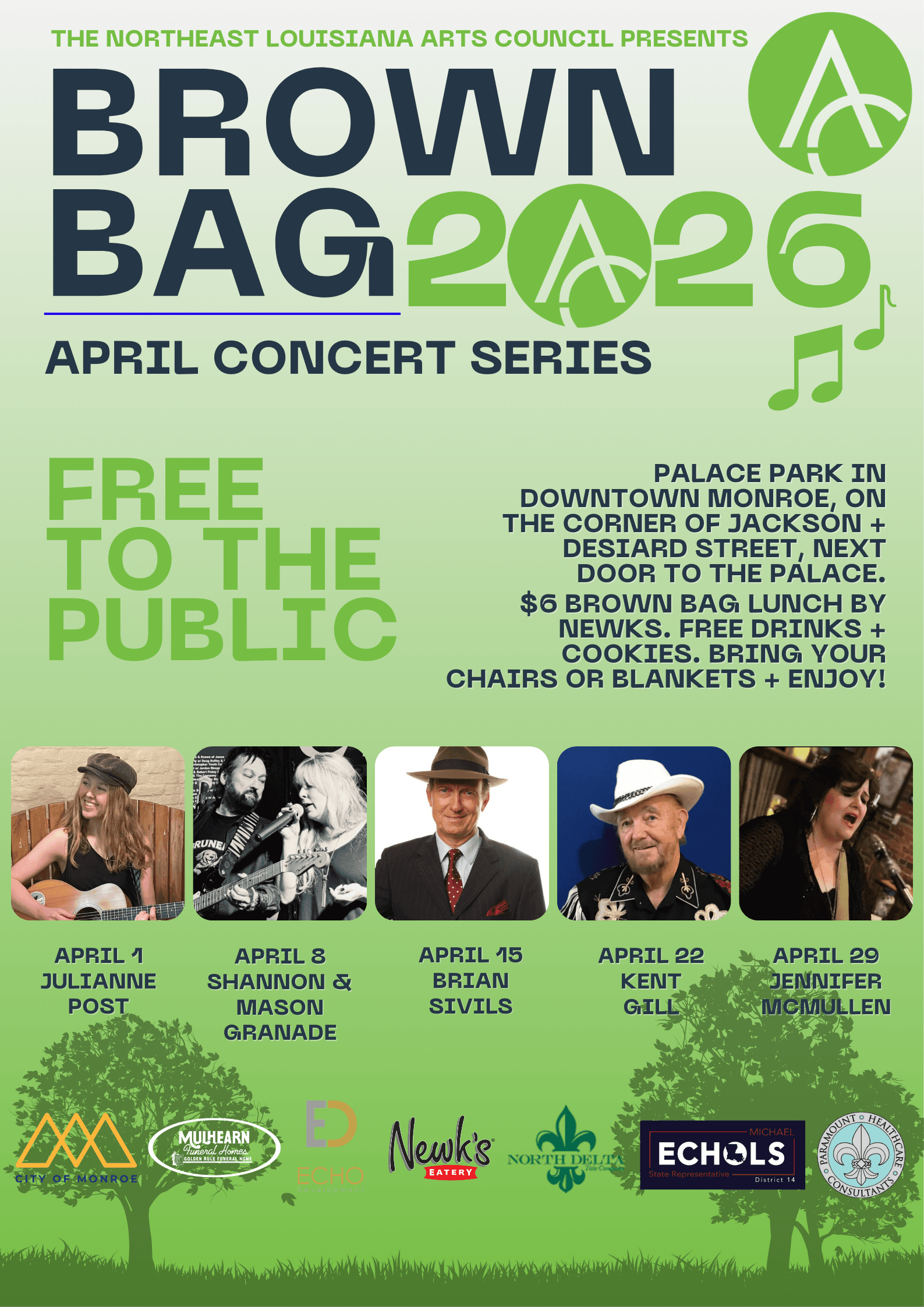 The Brown Bag Concert Series is free and open to the public, thanks to the generous support of our sponsors: Mulhearn’s, Newk’s Eatery, ECHO Development, Paramount Healthcare Consultants of West Monroe, North Delta Title, State Representative Michael Echols and The City of Monroe.
