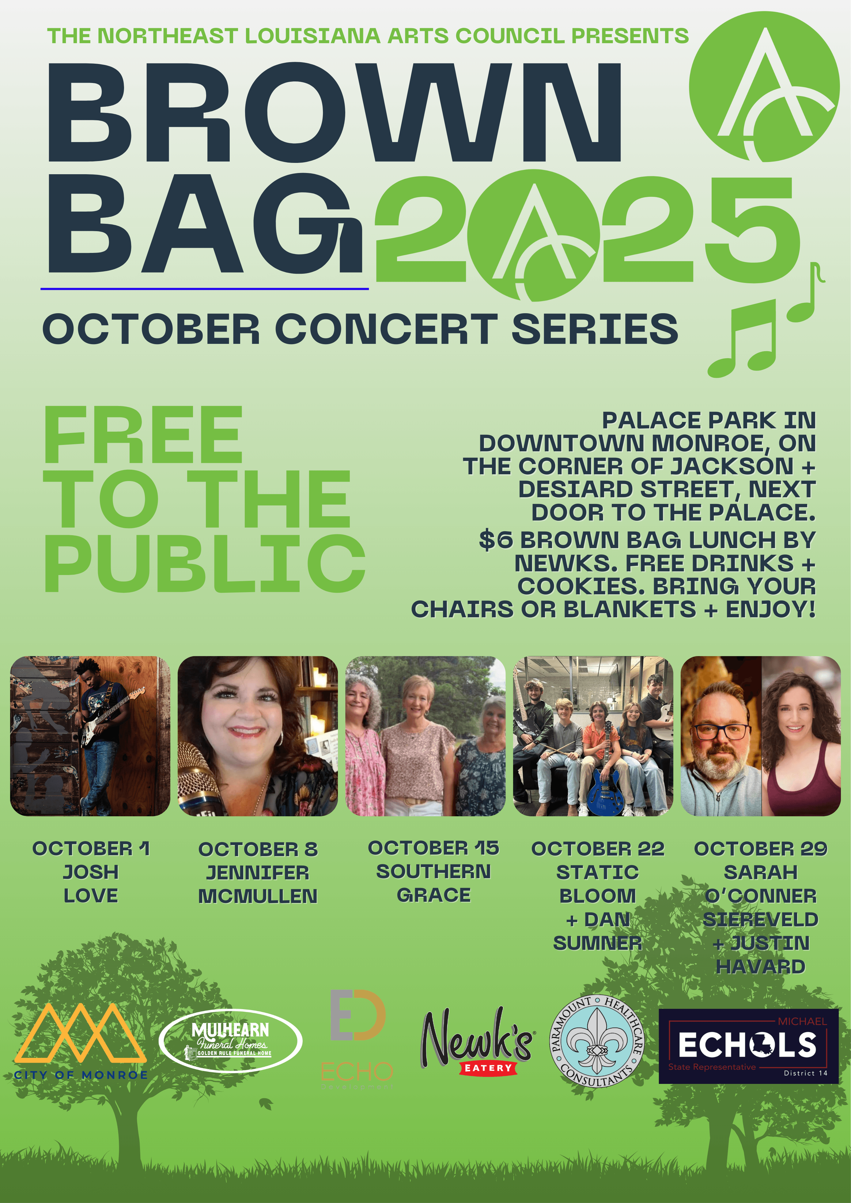 Come soak up the Fall sunshine and bask in the cooler breezes, while we treat you to a midweek miniconcert with some of our area’s best musicians! They’ll be on stage at lush, green Palace Park at 220 DeSiard Street (beside the old Palace Department Store). Picnic blankets and lawn chairs are always encouraged! Round up your friends, bring a picnic of your favorites, or treat yourself to a $6 box lunch, with tea, on site from Newk’s Eatery. Mulhearn’s will again provide free cookies to make the events extra sweet! Picnic blankets and lawn chairs are encouraged! Of course, the performances are FREE, thanks to our sponsors Mulhearn’s, Newk’s Eatery, ECHO Development, Paramount Healthcare Consultants of West Monroe, State Representative Michael Echols, and the City of Monroe.